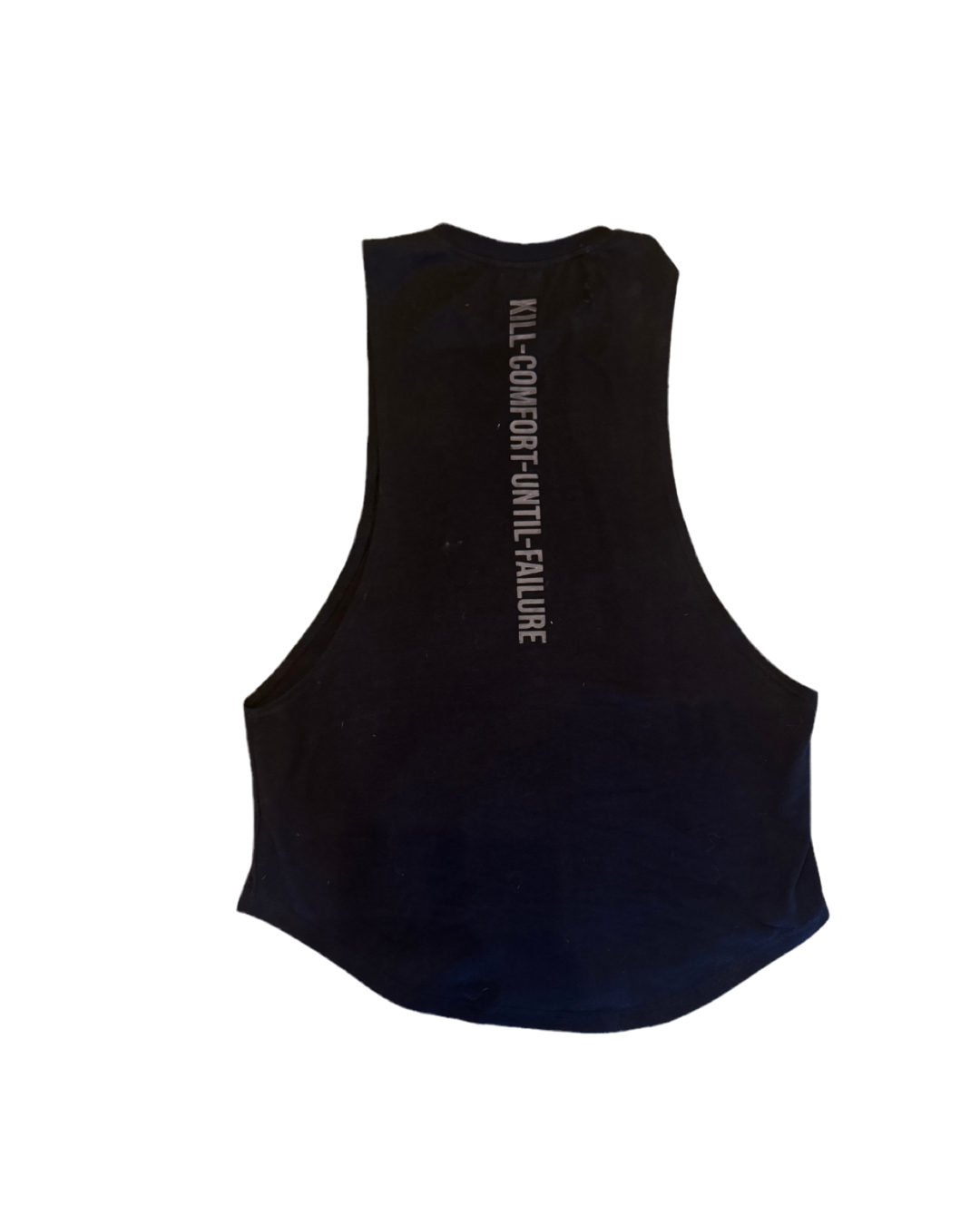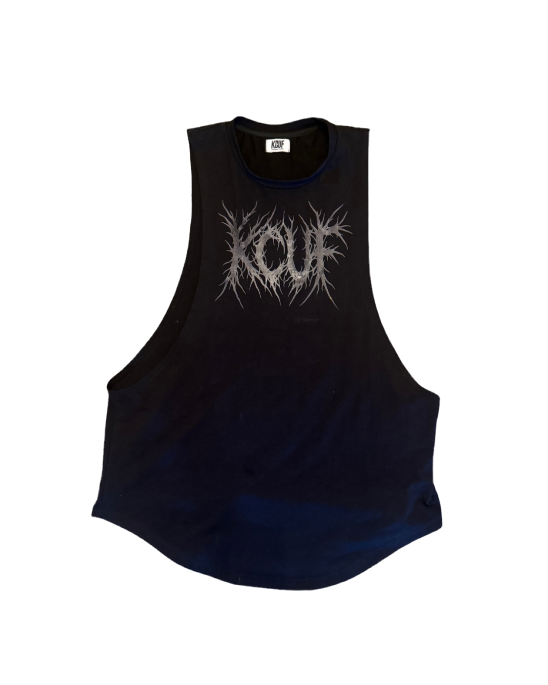 The flagship KCUF tank. Oversized drop armholes, relaxed fit, and built from an 88% cotton / 12% spandex blend that stretches, breathes, and refuses to quit. Finished with double-needle stitching, woven side tag, and the raw KCUF logo across the chest. Down the spine: Kill Comfort Until Failure — the words we live and die by.